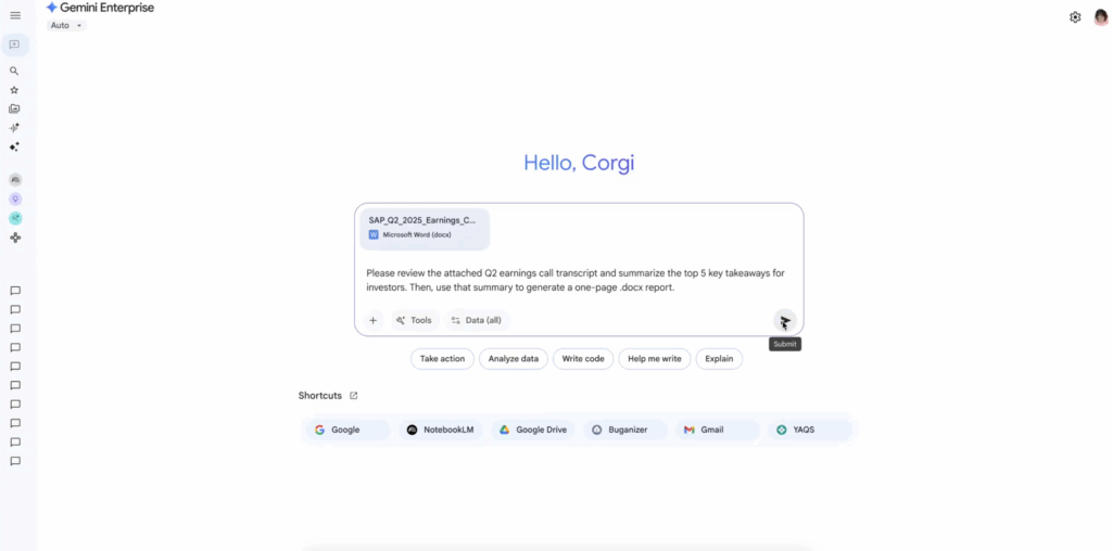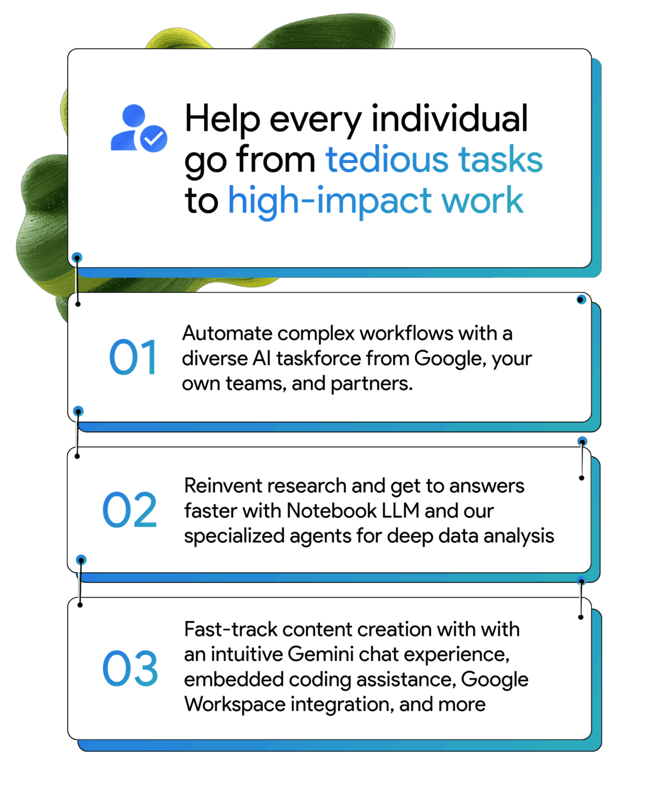 With Gemini Enterprise, every individual in any organization can shift from tedious tasks to high-impact work, thereby enhancing team productivity, fostering creativity, and improving business outcomes.