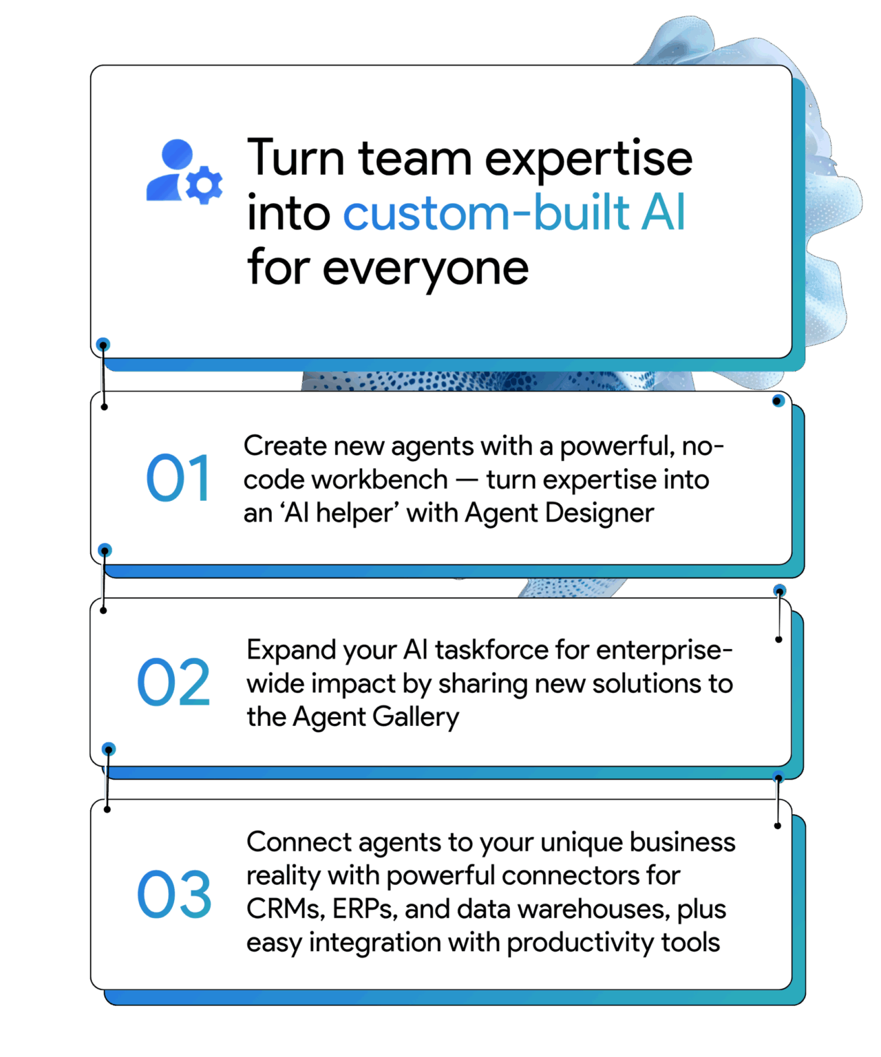 With Gemini Enterprise, your employees can access Google’s powerful AI models through an intuitive chat interface, deploy ready-to-use agents made by Google and our thriving ecosystem of partners, and even create their own custom agents with a powerful no-code workbench, all while maintaining your security, privacy and governance over all the agents.