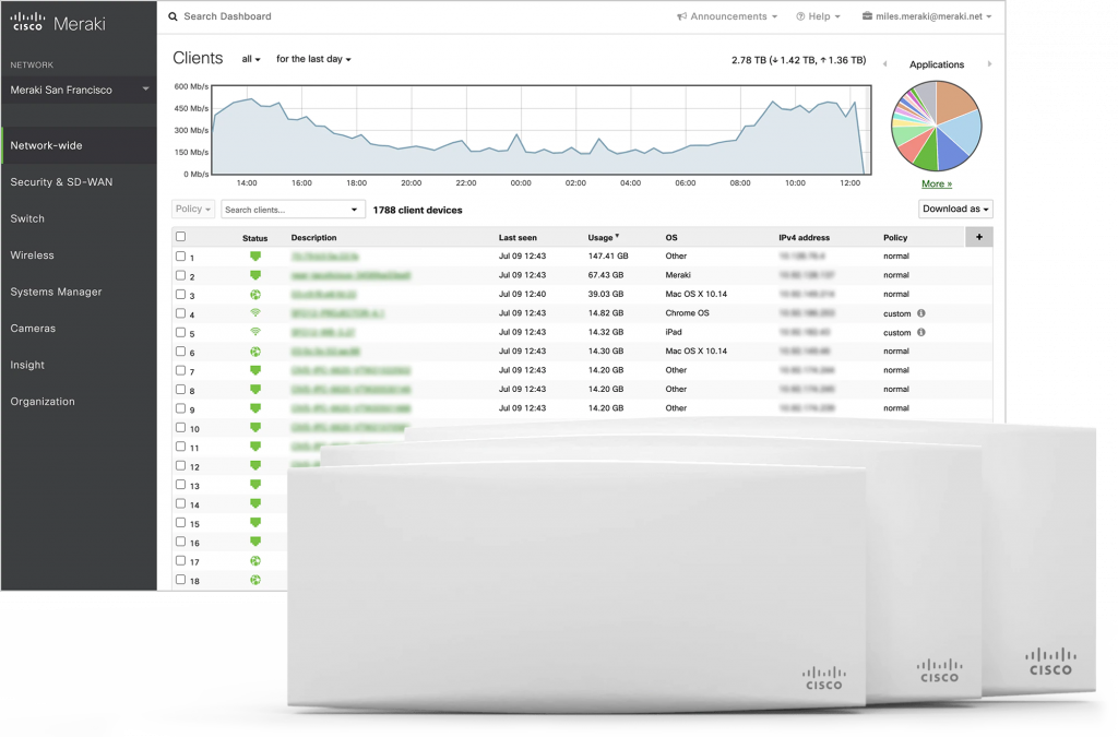 Meraki Network Solution helps you to gain visibility into the network users, their devices, and their applications. Armed with rich analytics, administrators can quickly create access control and application usage policies, optimizing both the end-user experience and network security.